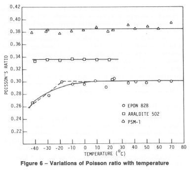 The Poisson's ratio did not show much variance for a large temperature range for Araldite 502 and PSM-1. For Araldite 502, the value of Poisson's ratio was found to be 0.335 in the interval -40 °C to 22 °C. The variation of ν with temperature is shown on Fig. 6. Also, the value of Poisson's ratio was found as 0.383, as opposed to manufacturer's value of 0.38, in the interval -40 °C to 70 °C for PSM-1. This property showed some variance for Epon 828 up to about - 10°C and then converged to a constant value of 0.300. For the lower end of the test interval an empirical expression can be found as