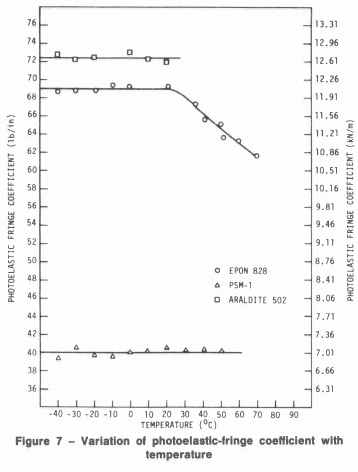 PSM-1 and Araldite 502 had constant photoelastic-fringe coefficients. In the interval -40 °C to 60 °C, on the average, the value of fσ for PSM-1 was 7.0 kN/m (40 lb/in.); and in the interval -60 °C to 25 °C, the value of fσ for Araldite 502 was, on the average, 12.7 kN/m (72.5 lb/in.). The value of fσ for PSM-1 is specified as 7.0 kN/m (40 lb/in.) by the manufacturer.