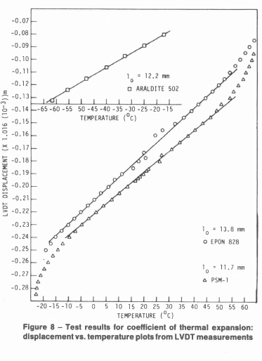 The thermal expansion coefficient (Fig. 8) is determined from the slope of the displacement vs. temperature plots. It is observed that between - 15 °C and 55 C, there is a linear range for Epon 828. A linear regression on the data in this range yielded the coefficient of thermal expansion as 1.36(10-4) °C-1. Similarly, a linear region exists for PSM-1 between -10 °C and 55 °C, and a linear regression yields the value of a as 1.46(10-4) °C_1. The data for Araldite 502 yielded a value for a of 9.5(10-5) °C-l from -65 °C to -15 °C.
