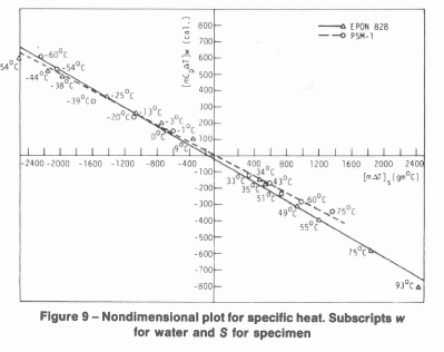 Figure 9 indicates that, for large temperature ranges, the specific heat values are constant for Epon 828 and PSM-1. The range is approximately -50 °C to 93 °C for PSM-1. The slopes of the lines yielded the value of C, as 0.328 W-h/kg °C (0.282 Btu/lb °F) for Epon 828 and 0.307 W-h/kg °C (0.264 Btu/lb. °F) for PSM-1. Araldite 502 also had a constant specific heat for the temperature range -60 °C to 25 °C. The average value of Cp for this material was 0.325 W-h/kg °C (0.280 Btu/lb °F).