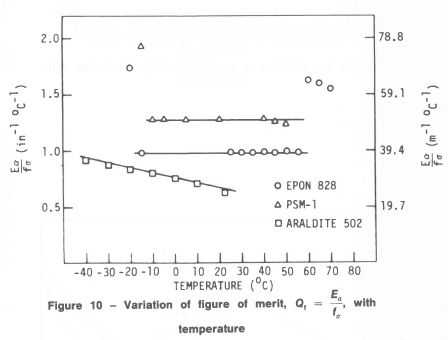 If the figure of merit is a constant over a temperature range, then the material can be used in thermal-stress modeling in that range. It is observed in Fig. 10 that such a range exists for two of the three materials tested. In the interval - 15 °C to 55 °C, Epon 828 has a constant Qt, = 38.27 m-1 °C-1 (0.972 in.-1 °C-1); and in the interval - 10 °C to 55 °C, PSM-1 has constant Qt of 49.61 m-1 °C-1 (1.26 in.-1 °C-1). Araldite 502 did not exhibit such a behavior and the Q vs. T relationship can be approximated by the straight line
