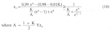 Equation (11) or (11*) cannot be solved analytically and, hence, a numerical method was used. As a result the function of the critical steam quality xcr vs the non-dimensional co-ordinate Yzcr for selected values of Κ, n and V was obtained. The results are shown in Fig. 6. For the sake of comparison the results of the analytic solution of the simplified form of equation (11) with the assumption of n = 1 and V = 0 are presented in Fig. 6. The above simplifications allow direct determination of the steam quality in the cross section of crisis (where the film disappears) as a function of non-dimensional co-ordinate of boiling Yzcr (or Yz cr).
