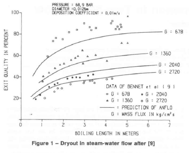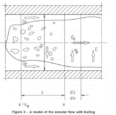 A general review on recent work in this field is provided for example in [17] and [24]. In this paper an analytic model of the boiling crisis at high vapour quality and the author's investigations ofthat phenomenon are presented. The model employs the analysis of the film dry-out process on the wall which allows formulation of the differential equations of mass balance in the film and the core. The solution of these equations contains the parameters which are determined experimentally, since their theoretical prediction involves serious difficulties.
