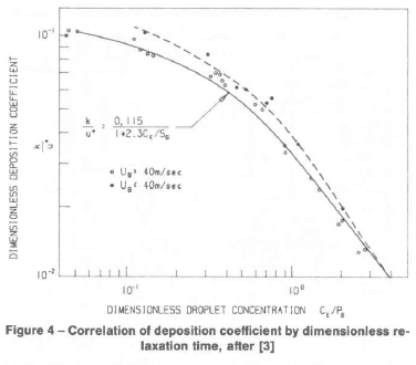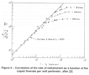 where Κ and C are the parameters not exactly defined at the moment. This assumption differs from the Harwell model, but according to [2, 3, 5, 8, 14, 29], experiments show that the dimensionless deposition coefficient is a function of the concentration of entrained droplets and the rate of entrainment is proportional to the liquid film flowrate and to the gas velocity, Fig. (4, 5). These relations are also expressed by eqs. (2, 3a).