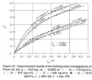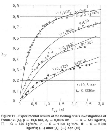 In order to determine both of these parameters an experimental apparatus was built and the experiments with Freon 21 performed. Fig. 8. From these experiments the dependence of the critical vapour quality xcr vs the boiling section length zcr was established. The length of the boiling section was determined from the heat balance with an additional assumption of xo = 0,01 at the beginning of the annular flow pattern. Subsequently, the curves predicted from the simplified analytic model [eq. (16)] were fitted to the experimental points using the least squares technique. Therefore, as a result of optimisation computations based on equation (16) the best values of the parameters Κ and Y were obtained. It was established that the parameter Κ for Freon 21 varies between 16 and 26 and may be assumed to be a constant equal to 20. Such an assumption slightly affects the analytic curve (16) and substantially simplifies further considerations.