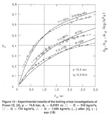 For the sake of comparison the predictions after the model described here were carried out for the experiments with Freon 12 performed by Stevens, (after [4]). The results, shown in Figs. 10-12 are in very good agreement with the experiments, particularly at lower mass fluxes. In the experiments mentioned above the mass flux G and the tube diameter d„ varied and the pressure was kept constant. The relevant formula for Y for Freon 12 takes the form.