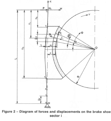 An active force Ρ causes a pressure on the surface of contact between the brake shoe and the rim. Consider that force Ni is the normal resultant of contact pressure on the surface of the sector i then Ni = kiti