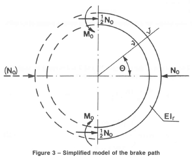 For modelling the brake rim deformation a circular ring with constant cross-section, compressed by radial concentrated forces N0 distributed symmetrically (figure 3) is assumed. The radial displacement z of the rim in the section υ - ο is expressed by equation (13) which is obtained from the one half-ring calculation using Castigliano principle.