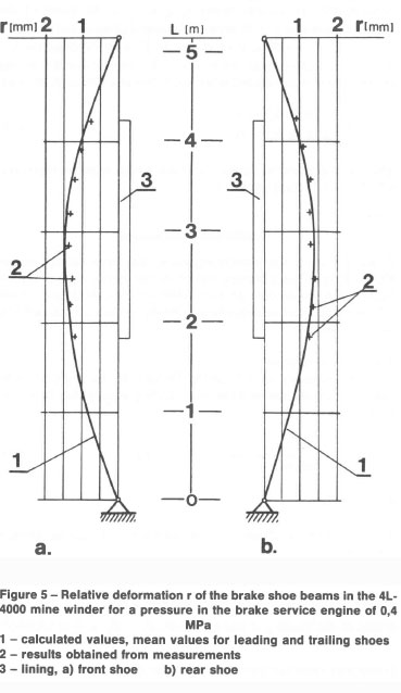 For the selected mine hoist with the post type drum brakes the calculations and full-scale measurements of the pressure distribution and the shoe and path displacements have been conducted. The comparison between the calculated and the measured values are presented in figures 4, 5 and 6. The results show that the proposed method of calculation gives a more accurate prediction of the friction brake performance.