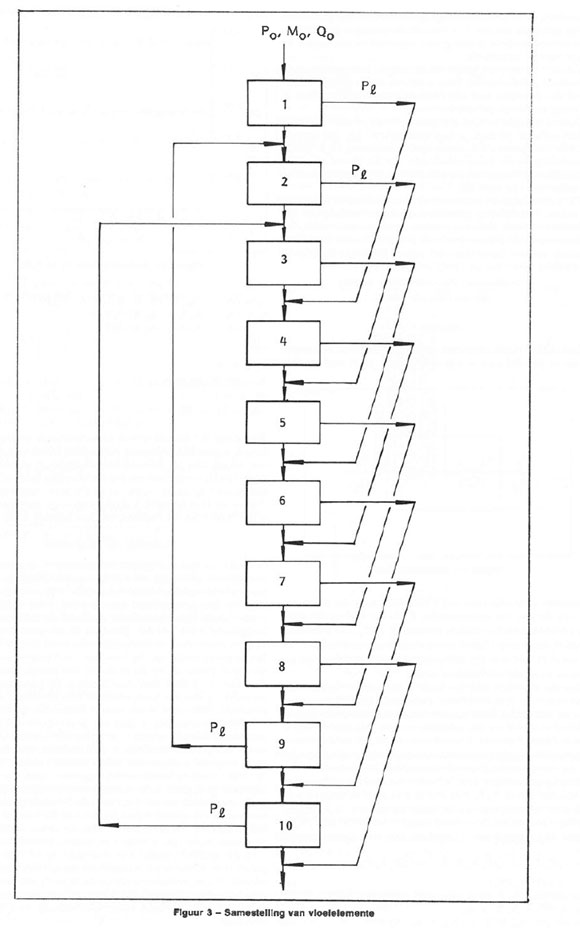 'n Reeks van tien soortgelyke komponente is opgebou, elk met ander fisiese afmetings. Hierdie komponente kan nou geskakel word om 'n werklike stelsel te simuleer. Een moontlike opstelling, wat hier as voorbeeld gebruik word, word in figuur 3 getoon. Uit die figuur kan afgelei word dat die druk waarby elke komponent werk, verskil. Die druk in komponent een is die hoogste en die druk in komponent tien is die laagste. Verder is kompressors nodig om die £-strome van komponente nege en tien op te pomp tot by die drukvlak van komponente twee en drie. Daar is 'n sterk interaksie tussen al die komponente en 'n verandering van een komponent se karakteristieke of bedryf-stoestande beïnvloed al die ander komponente se werking.