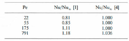 Die betrokke energievergelyking kan ook analities opgelos word vir die gegewe randvoorwaardes [4]. Hierdie analitiese oplossing is gebruik om die Nusseltgetalle te bereken vir die geometrie en die vier Peclet-getalle waarvoor berekende waardes in figuur 4 van verwysing [1] aangebied word. Vergelykende resultate word gegee in die meegaande tabel, waaruit dit duidelik is dat die kanaallengte wat in die numeriese model van verwysing [1] gebruik word, voldoende is om volontwikkelde waardes te bereken, behalwe vir die hoogste Peclet-getal.