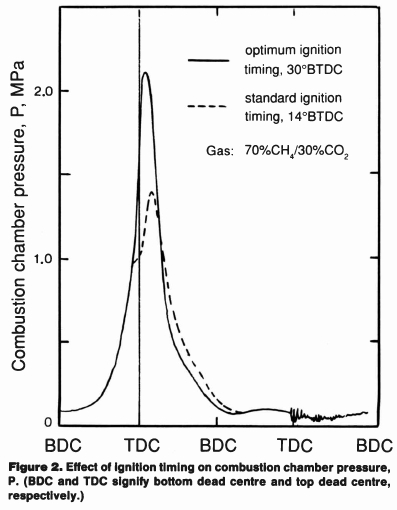 Maximum power was found to be 17% lower on fuelling with pure CH4 rather than with petrol. Increased CO2 content of the gas led to further losses with a 28% loss (compared with pure CH4) at 41% CO2. These findings were explained essentially in terms of the successive decrease in energy input per combustion cycle [1]. Not mentioned was the fact that the flame front velocity (at constant mixture strength) is lower for CH4 than for petrol [4] and decreases further on dilution of CH4 with CO2 [5]. This means that, with fixed ignition timing, the peak combustion chamber pressure must become increasingly retarded on the successive replacement of petrol with CH4 and with biogases of increasing CO2 content. This was borne out in a subsequent study [3]: peak cycle pressures occurred at 4° after top dead centre (TDC) on petrol fuelling, at 17° after TDC on CH4 fuelling and in the region of 34 to 42° after TDC on fuelling with a 50% CH4/50% CO2 gas. Clearly therefore the power output on gas fuelling can be increased by advancing the ignition timing.