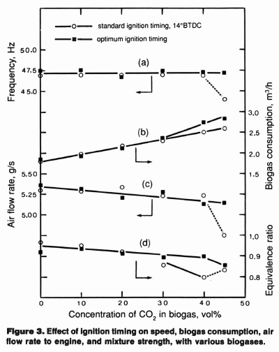 While the benefits of optimisation of ignition timing of biogas-fuelled SI engines are evident from the foregoing, the feasibility of its implementation in developing technology situations is dependent on engine type. For small engines of non-variable ignition timing it would probably be best to effect a once-off modification to a fixed advance of some 27° before TDC. Casual tests on our engine with such timing gave powers close to maximum for 'reasonable' bagases (25 to 40% CO2). Rough running, however, persisted at CO2 concentration of 40% and greater. The performance on petrol fuelling with such advanced spark timing was also satisfactory.