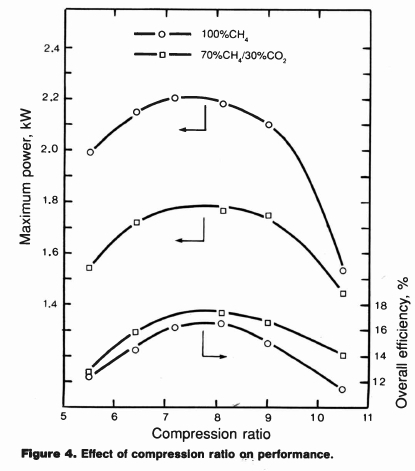The overall efficiencies shown in Figure 4 show the same trend with CR as does maximum power. This is consistent with the combustion chamber events suggested above. Higher efficiencies were obtained with CO2-dilut-ed fuel than with pure CH4. This behaviour is normal (for CO2 concentrations of 0 to 50%) with conventional operation of the fuel supply system [3]; the behaviour shown in Figure 1(c) (open data points) was due to the altered method of fuelling.
