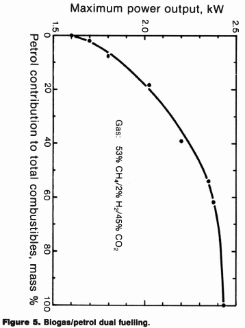 Figure 5 shows results, thus obtained, for a fuel gas of 45% CO2 and 2% H2 content. Maximum power is plotted as a function of petrol content of the fuel, the latter given as mass percent of the total combustibles (CH4, H2 and petrol). The entire range of fuels extending from pure gas to pure petrol was covered. The admixture of petrol to the biogas resulted in improved maximum power in all cases, but most markedly so at low percentages of petrol. The equivalence ratio increased from 0,74 on gas-only fuelling, to unity at 40% petrol, and to 1,28 on all-petrol fuelling.