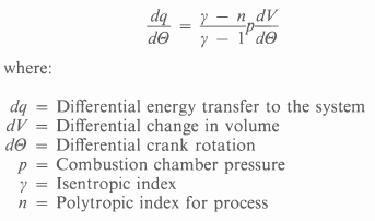 The polytropic index was calculated from the change in pressure and volume over each increment. The value of y used was that for air expressed as a function of temperature only. The heat term was split into the chemical energy liberated by the combustion of fuel and the energy transferred to the walls of the combustion chamber. This latter term was approximated by using the relationships recommended by Annand [12].