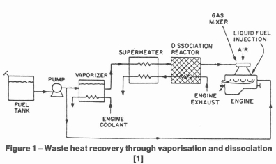 Since this is an endothermic reaction the heat of combustion of the products is higher than that of liquid methanol. By using the thermal energy of the engine coolant and exhaust gases to drive this reaction and then fuelling the engine with the dissociated methanol (DM) regeneration can be achieved. Figure 1 shows the schematic layout of an engine modified in this way.
