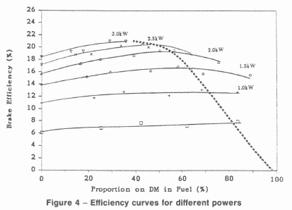 Figure 4 shows data obtained by interpolation of the results in Figure 2. The curve shows how the efficiency varied for a given power as the proportion of DM in the fuel changed. The locus of the maxima is plotted. This represents the proportion of DM in the fuel which gave maximum efficiency. If the curve is extrapolated it passes through 100% at zero power. At 3 kW power, maximum efficiency occurred when there was only 40% DM in the fuel mixture. The proportion of DM in the fuel which gave maximum efficiency decreased as the power output increased. This curve for optimum operation could be approximated in practice by having a small dissociator operating at maximum capacity as mentioned earlier.