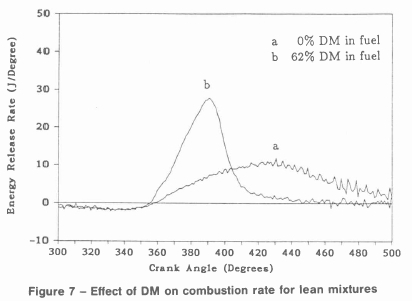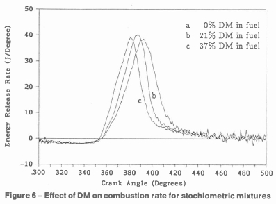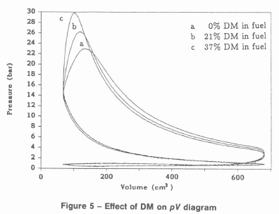 During expansion the curves cross over. The reason for this is that, although the equivalence ratio is the same, the mass of fuel in the combustion chamber decreases as the fraction of DM in the fuel is increased. This is so because the gaseous DM fuel is displacing air so that less fuel is required to give the same equivalence ratio. Thus the pressure must eventually be higher for pure methanol fuel since there is more fuel to burn in the combustion chamber.