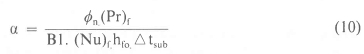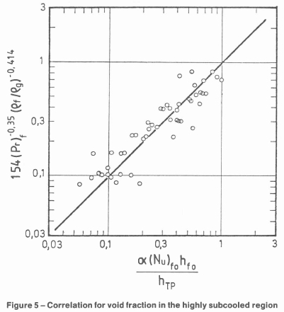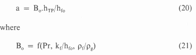 As noted previously, the model of Griffith et al. [4] for estimation of the void fraction in the highly subcooled region is not suitable, for it gives incorrect results at low pressures. It was postulated that the void volume per unit surface area, a, would be proportional to the ratio of the boiling heat transfer coefficient hTP to the single phase heat transfer coefficient hfo multiplied by a proportionality constant Bo, which would be a function of the pressure and of the hydrodynamic layer thickness which in turn, is related to the thickness of the termal boundary layer (kf/hfo