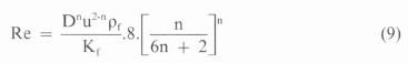 where ff, the Fanning friction factor, is obtained from the conventional Reynolds number-Fanning friction factor plot using a velocity defined as
