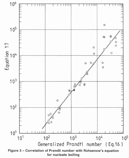 Data for the heat flux transferred by bubble nucleation was obtained by subtracting the single phase forced convection heat flux calculated using equation (3), from the total heat flux imposed during the experiment. The residual term was correlated as suggested by Rohsenow and Griffith [11]. A plot of the generalized Prandtl number [13]