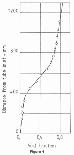 The change in void fraction that takes place in the evaporator tube is shown in Figure 1. At first the vapour formed consists of discrete bubbles attached to the tube surface, but at C they become detached to form bubbly flow. At point D boiling extends across the tube. Coalescence of the bubbles occurs fairly rapidly and transition to slug flow may take place.