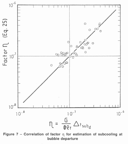 A regression of η versus Pr indicated that the Prandtl number also has a significant influence on the subcooling at the point of bubble departure, with departure taking place at a higher subcoolilng as the Prandtl number increases. Again, this must result from the more intense frictional drag acting on the bubbles, since variation in the value of the Prandtl number is caused mainly by the change in viscosity.