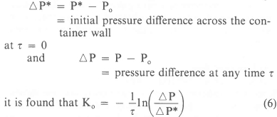 Referring to figure 1, an ordinary water manometer or other differential pressure measuring device could be connected to the container as shown. An initial pressure difference can be obtained by either feeding a small amount of compressed air to the container or evacuating it slightly . After closing the valve the initial pressure difference, ΔP*, can be determined and the remaining difference, ΔP, after a time τ has elapsed. Ko can then be calculated. To obtain a more accurate experimental value of Ko, several values of ΔP may be obtained at different time intervals. The slope of the regression curve fitted to these experimental points, on a semi-log scale will provide the value of Ko.
