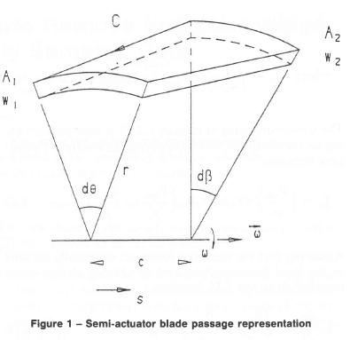 This equation is strictly applicable to a flow model in which the blade rows are present. For the present type of flow model where an actual blade row is replaced by a cascade containing an infinite number of infinitely thin blades, the actions of the blades must be replaced by the effects of extraneous forces. However, as the line integral around the closed contour C is taken, only the loss producing or non-conservative forces need to be considered; the line integral of a conservative force such as that produced by blade lift is zero.
