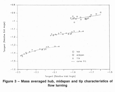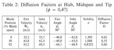 When the data was applied to the hub, midspan and tip regions a far better correlation was obtained; the model predicted that the tip would stall first at an inlet angle βls equal to - 68,4 degrees. This is 0,4 degrees from the measured inception point. The fact that the rotor first experienced tip stalling was confirmed by experiment. If the diffusion factors are compared at tip, hub and midspan as in table 2, it would be erroneous to believe that as the hub has the highest value it would stall first. It is however interesting to note that the rule of thumb stating that a diffusion factor greater than 0,6 leads to stall, is generally valid here.