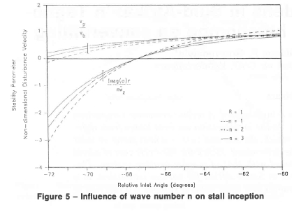 Stall inception occurs when the imaginary part of the root passes through zero and becomes negative. There is no direct reference in the stall inception limit expression to the blade row characteristics other than the blade loss and turning relationships, and overall area ratio; although the blade chord c which is incorporated in L features in the eigen-value matrix it is only included in the real and imaginary components of σas part of a multiplier. It does not influence the point at which the damping factor passes through zero. From this it can be inferred that although it has been found by experiment that an increase in chord length improves the stall limit of a blade row, it does so in an indirect manner via the blade loss and turning characteristics.