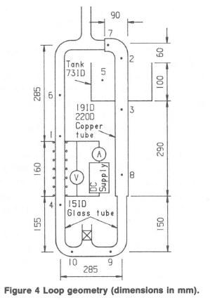 Heating was by means of an evenly spaced resistance wire wrapped round the glass tube. Although the loop was insulated (except for a short portion along the lower horizontal portion where the velocity measurements were taken) the heat rate into the fluid from the resistance wire was estimated as only 70% of the power input indicated by the DC voltmeter and ammeter.