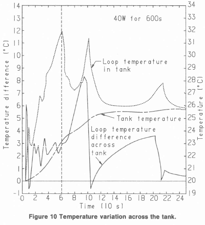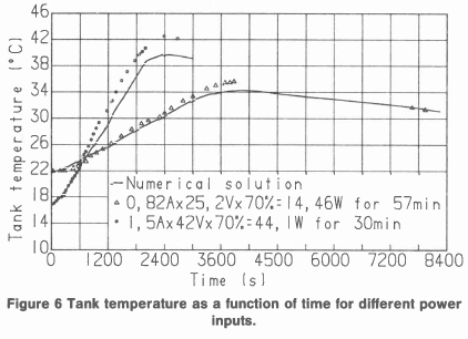 In order to ascertain the relative effect of the many variables involved in the solution of this sort of problem a sensitivity analysis was done. Each of the parameters was varied from a base case value by 10% and the tank temperature after 10 minutes was calculated. The difference between this value and the base case tank temperature after 10 minutes is given in table 1 where it can be seen that the greatest difference is attributable to errors in the input power.