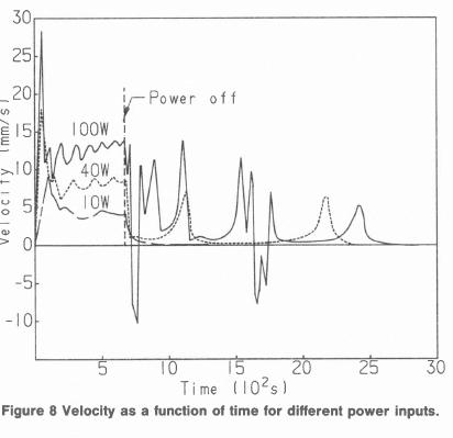 Figure 8 illustrates the case where the loop is supplied with a constant power input and which is maintained for 600 seconds before being switched off. Constant powers of 10W, 40W and 100W are illustrated. For the 10W case the loop velocity decays gradually down to zero after the power is switched off. At 40W and a velocity of 8 mm/s at switch-off the velocity decays quickly but after 1000 seconds had recovered to 7 mm/s again decayed and after 20 000 seconds again increased, this time to 6 mm/s, but for the last time before decaying rather rapidly down to zero. The larger power of 100 W results in a velocity of 13 mm/s at switch-off. The velocity in this case is so great that a flow reversal occurs, repeats itself again after 1 500 seconds and by 2 500s the velocity for this case has also decayed to zero.