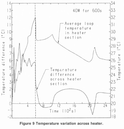 The transient liquid temperatures in the heater section of the loop are given in figure 9, for the constant 40W power input for 600s case. Figure 10 gives the transient temperatures in the "tube-in-tank" section of the loop.