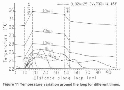 The start-up transient temperatures along the loop are given in figure 11. This was for a constant power input of 14,46W. During the first 5 minutes the highly non-linear nature of the temperatures of the liquid in the loop is illustrated until after 10 minutes the temperatures are linear along the loop, albeit increasing steadily with respect to time.