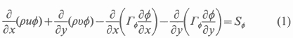where ν= 1,u,v,T,k and ε; ΓΦ is the effective diffusion coefficient; SΦthe source term, and u and v are the velocity components in the x and y directions respectively.