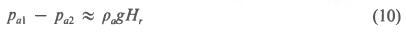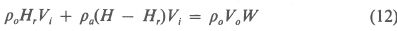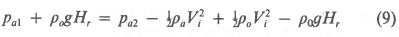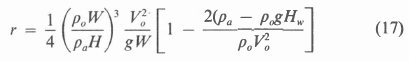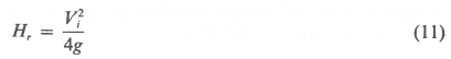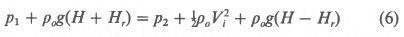 Consider the particular streamline at the outlet of the heat exchanger that diverges from the plume and forms the outer "boundary" of the recirculating air stream. It is assumed that the distance, Hr, that it rises above the heat exchanger is the same as the distance Hr that it sinks below the heat exchanger. At the elevation (H + Hr) it passes through a stagnation point and at the elevation (H - Hr) the streamline enters the cooling tower at a velocity Vi. Let the highest position of the streamline be point 1 and the lowest position be point 2. By neglecting viscous effects, mixing, and heat transfer to the ambient air and applying Bernoulli's equation, we find for steady-state conditions: