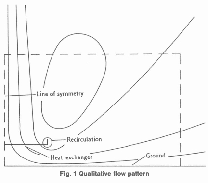 A cross-section of one half of a two-dimensional mechanical-draught heat exchanger and the associated air flow pattern is depicted in Figure 1. In the absence of wind, the buoyant plume or jet rises vertically above the heat exchanger. This results in ambient air being drawn in underneath the heat exchanger and sets up a large recirculating cell. Some of the ambient air is also dragged along by the rising plume and this also acts as a further driving mechanism for the cell. Part of the warm plume air may, however, be drawn back into the inlet of the heat exchanger. This phenomenon is known as "recirculation" and is confined to the area surrounding the end of the heat exchanger as opposed to the larger scale circulation mentioned above. This phenomenon can have an adverse influence on the performance of the heat exchanger and therefore indirectly reduces its effective size.