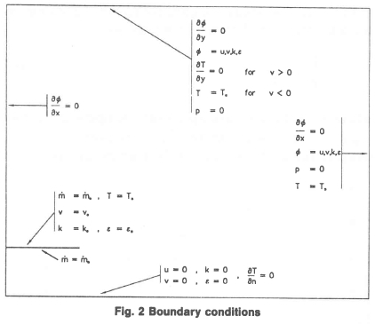 The velocities are all set to zero on the ground. The values of the velocities and the turbulence parameters near to the solid surface are calculated using the wall-functions described by Launder and Spalding [16].