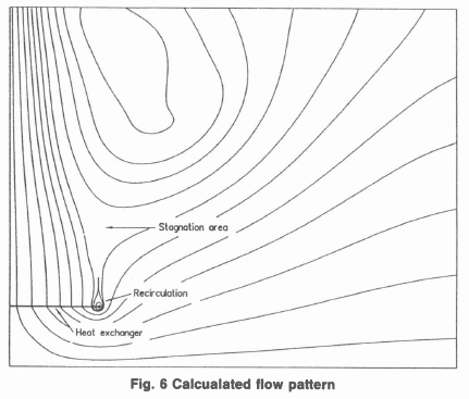 The predicted flow field is in good agreement with the expected flow pattern and shows the various recirculating cells which are formed. The presence of a stagnation point between the recirculation cells above the heat exchanger is also observed.