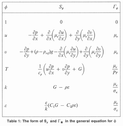 In the case of the temperature equation the source terms are assumed to be much smaller than the other terms and are therefore neglected in the simulation. The effective viscosity μe is given by:
