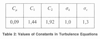 The Prandtl number in the temperature equation is taken as Pr = 0.71, whilst the laminar dynamic viscosity is taken as μ= 1.8 ×10-5 N • s/m2. The empirical constants which appear in the turbulence equations are assigned the values shown in Table 2 which, according to Rodi [11], had been found to give good agreement over a wide range of two-dimensional flows.