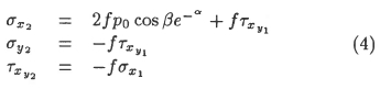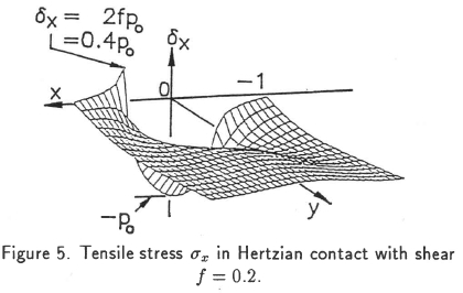 The distribution of the tensile stress σx is shown in Figure 5 for a coefficient of friction of f = 0.2. At the left end of the contact zone the tensile stress parallel to the surface has a peak of 2fp0, where p0 is the maximum Hertzian pressure. In gears with p0 often greater than 1500 MPa and f = 0.15 (which is a high value assuming marginal lubrication) the tensile peak is greater than 450 MPa, which is close to the endurance limit.