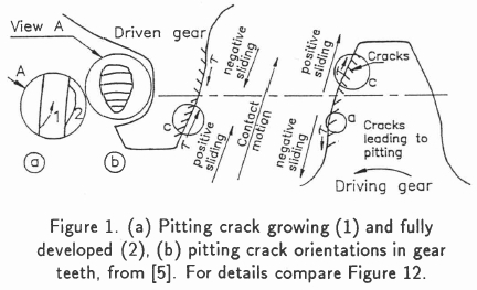 Pitting is a surface fatigue failure and occurs where surfaces come into contact under conditions of rolling/sliding motion, high surface loading, and marginal lubrication. It starts at small asperities and becomes wider as it grows (Figure 1a). The pitting cracks start at angles of 10 to 30°. The coefficient of friction in gears is normally smaller than 0.15.