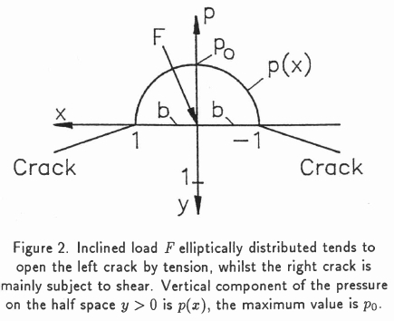 Load case A assumes the whole load to be repeating. The contact width was considered constant, so that the calculation does not present a rolling or sliding contact, but in the case of an external elliptic load, normal p(x) (Figure 2) and tangential fp(x) applied repeatedly. However this case did give some insight into the crack initiation in gears (Figure 1).