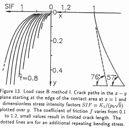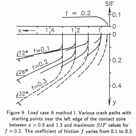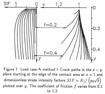 The calculations were done for starting points x = 1.3-1.0 (edge of contact at x= 1.0), 0.9 - 0.2 and coefficients of friction f = 0.1 to 1.2. Crack paths were not found for all these parameters and of the existing ones only a selection at the edge of the contact area was shown.