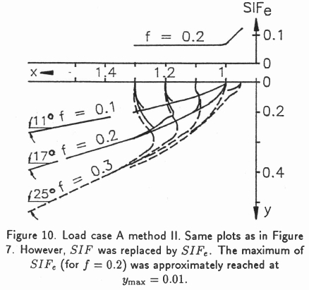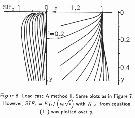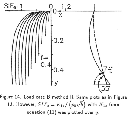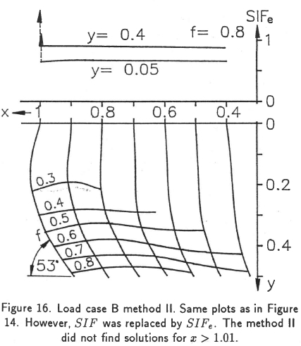 Load case B method I with a crack starting at the edge of the contact area x = 1 is shown in Figure 13 and the same with method II in Figure 14.