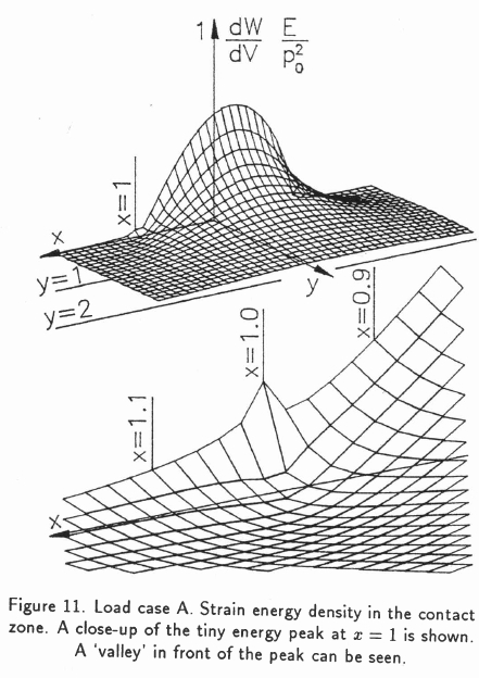Most of the strain energy resides in or below the contact area and it is remarkable that only the small energy peak at x = 1 should produce a crack. Most conventional explanations for rolling damage point to the maximum shear stress τmax = 0.3po at y = 0.78, which certainly explains damage starting from defects at that lower y level. The two explanations, the conventional based on τmax and the one presented here, describe two distinct failure mechanisms, the first starting well below the surface and the second on the surface.